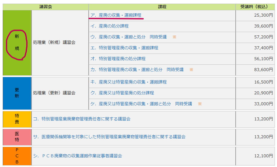 「ア 新規・産廃収集運搬過程」 を受講してください。受講料は 25,300円 です。