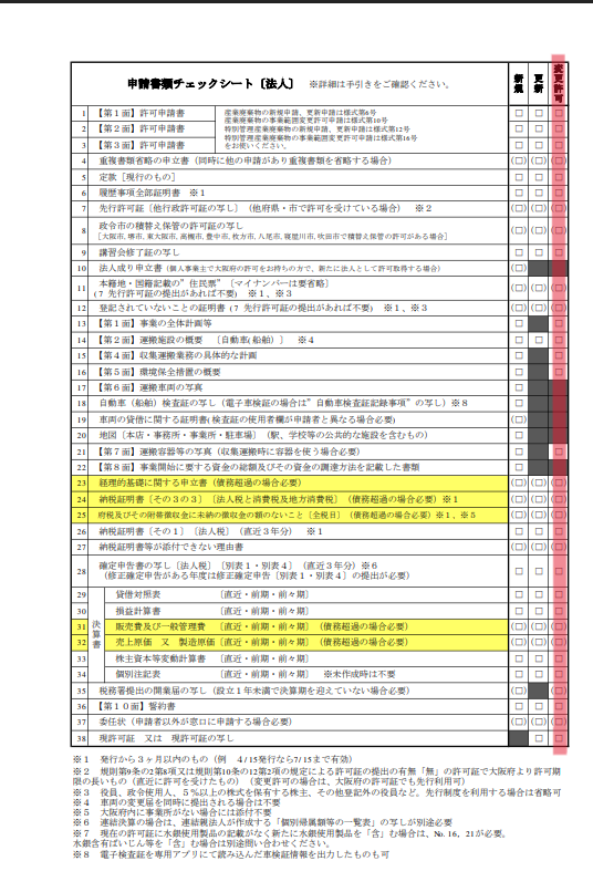 大阪府の変更許可申請にて必要な書類一覧になります。