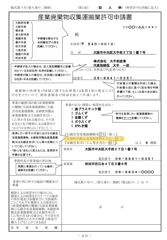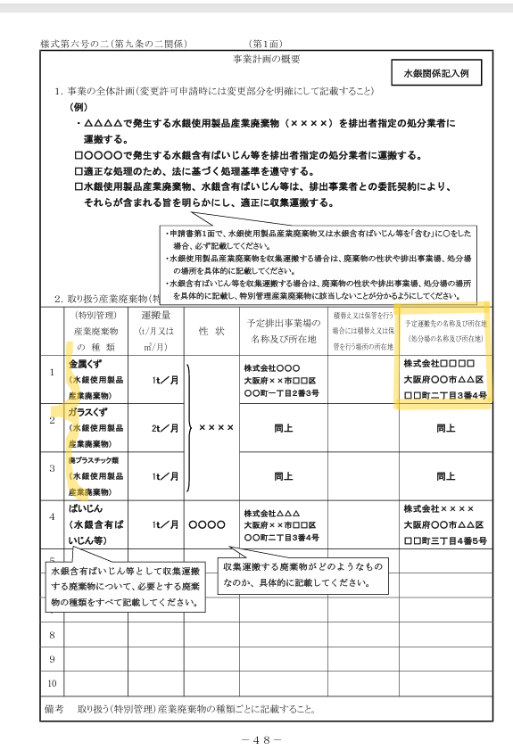 事業計画書に記載する「予定排出事業場・予定運搬先」については、「予定排出事業場」は、建設工事に伴って発生する場合であれば、「大阪府内の建設現場」といった記載で足りますが、「予定運搬先」については水銀使用製品産業廃棄物を受け入れることができる処分場を、具体的に記載する必要があります。