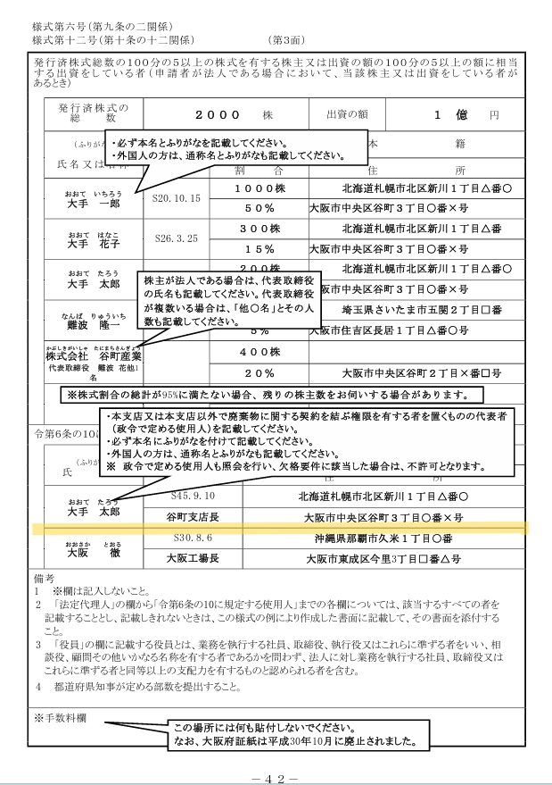 まず、申請書の様式第六号(第3面)において、使用人の「氏名」「生年月日」「役職」「本籍」「住所」を記載する必要があります。