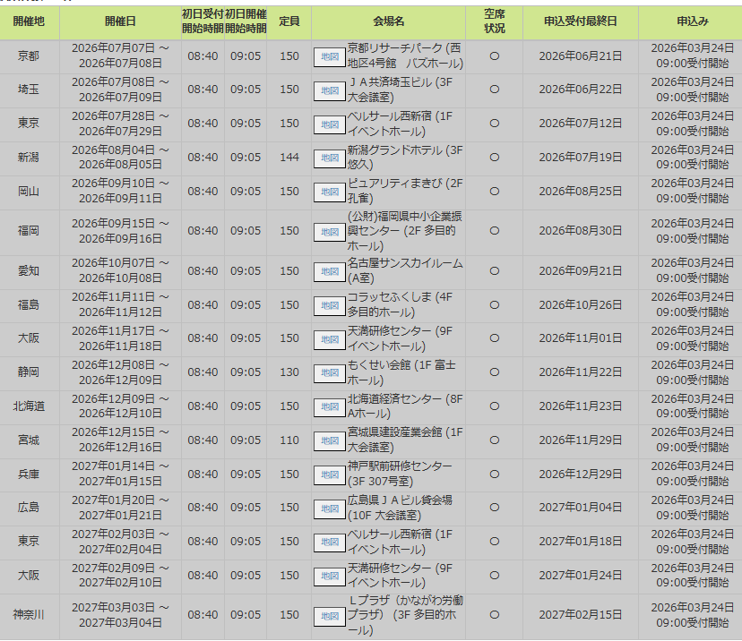 講習会は全国どの会場でも受講することが可能ですので、「できるだけ早く受講したい」という方は、関西圏に限らず他の地域の会場を選択することも有効です。特に5月、6月開催分については、例年早い段階で満席になる傾向があります。オンライン講習も含め、人気の日程はすぐに埋まってしまうため、受付開始直後の予約が重要になってきます。